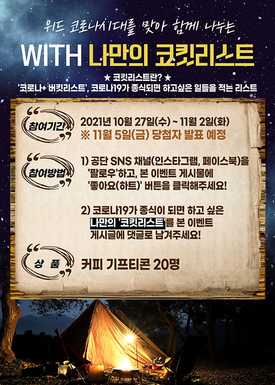 ÄÚŶ¸®½ºÆ®´Â ¡®Äڷγª¡¯¿Í ¡®¹öŶ¸®½ºÆ®¡¯ÀÇ ÇÕ¼º¾î·Î, Äڷγª19°¡ Á¾½ÄµÇ¸é ÇÏ°í ½ÍÀº ÀϵéÀ» Àû´Â ¸®½ºÆ®¸¦ ¸»ÇÑ´Ù. º» À̺¥Æ®´Â °ø´Ü SNS ä³Î(ÀνºÅ¸±×·¥, ÆäÀ̽ººÏ)À» ÆÈ·Î¿ìÇϰí À̺¥Æ® °Ô½Ã¹°¿¡ ÁÁ¾Æ¿ä(ÇÏÆ®) ¹öưÀ» Ŭ¸¯ÇÑ ÈÄ, ÀڽŸ¸ÀÇ ¡®ÄÚŶ¸®½ºÆ®¡¯¸¦ ´ñ±Û·Î ³²°Ü Âü¿©ÇÒ ¼ö ÀÖ´Ù.