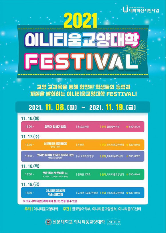 | | ¡è¡è ¡ã¼±¹®´ë 2021 ÀÌ´ÏÆ¼¿ò±³¾ç´ëÇÐ Æä½ºÆ¼¹ú Æ÷½ºÅÍ. | ¨Ï ¿Â¾ç½Å¹® | |