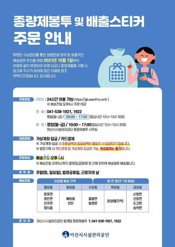 ¾Æ»ê½Ã½Ã¼³°ü¸®°ø´Ü(ÀÌ»çÀå ÀÌÁ¾¹Î, ÀÌÇÏ °ø´Ü)Àº Á¾·®Á¦ºÀÅõ ¹× Æó±â¹°½ºÆ¼Ä¿ µîÀÇ ÆÇ¸Å ¿î¿µÃ¼°è¸¦ °³¼±Çß´Ù°í 11¿ù 30ÀÏ ¹àÇû´Ù.