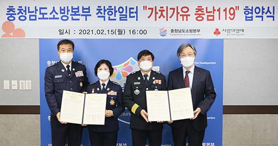 Á¶¼±È£ Ãæ³²¼Ò¹æº»ºÎÀå°ú ·ù¼®¸¸, ¹ÚÈ¿¼÷ Ãæ³²ÀÇ¿ë¼Ò¹æ´ë¿¬ÇÕȸÀåÀº Ãæ³²»çȸº¹Áö°øµ¿¸ð±Ýȸ(ÀÌÇÏ ¡®»ç¶ûÀÇ ¿¸Å¡¯) ¼º¿ìÁ¾ ȸÀå°ú 15ÀÏ µµÃ»¿¡¼ ¡®°¡Ä¡°¡À¯ Ãæ³² 119¡¯ ±â±Ý Á¶¼º°ú ¿î¿ëÀ» À§ÇÑ ¾÷¹« Çù¾àÀ» ü°áÇß´Ù.