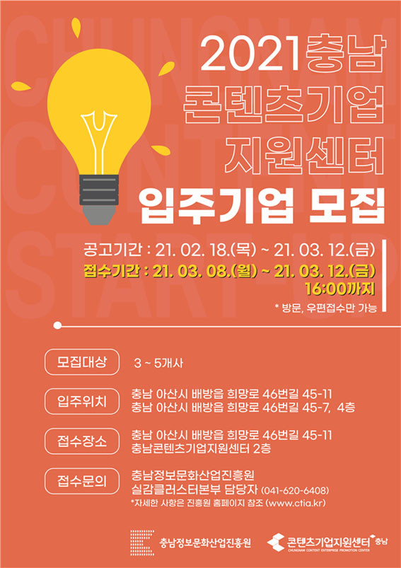 Ãæ³²µµ¿Í ¾Æ»ê½Ã°¡ ÈÄ¿øÇÏ´Â Ãæ³²Á¤º¸¹®È»ê¾÷ÁøÈï¿ø(ÀÌÇÏ ÁøÈï¿ø)ÀÌ Áö¿ª ÄÜÅÙÃ÷ »ê¾÷ ¹ßÀüÀ» À̲ø¾î³ª°¥ Ãæ³²ÄÜÅÙÃ÷±â¾÷Áö¿ø¼¾ÅÍ(ÀÌÇÏ Áö¿ø¼¾ÅÍ) ÀÔÁÖ±â¾÷À» ¸ðÁýÇÑ´Ù.