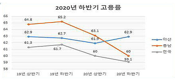 Åë°èûÀÇ 2020³â ÇϹݱâ Áö¿ªº° °í¿ëÁ¶»ç ¹ßÇ¥¿¡ µû¸£¸é ¾Æ»ê½Ã °í¿ë·üÀº 62.9%·Î Àü³â µ¿±â´ëºñ 0.2% »ó½ÂÇß´Ù.