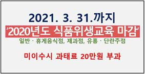 ½ÄǰÀ§»ý¹ý¿¡ µû¶ó ½Äǰ¿µ¾÷ÀÚ´Â ¸Å³â 3½Ã°£ÀÇ À§»ý±³À°À» ¹Þ¾Æ¾ß ÇÑ´Ù. ±³À°À» ¹ÞÁö ¾ÊÀº ¿µ¾÷ÀÚ´Â °úÅ·á 20¸¸ ¿øÀÌ ºÎ°úµÇ¸ç Æó¾÷ ¾÷¼Ò´Â ¾Æ»ê½Ãû À§»ý°ú¿¡ Æó¾÷½Å°í¸¦ ÇØ¾ß °úÅ·ᰡ ºÎ°úµÇÁö ¾Ê´Â´Ù.