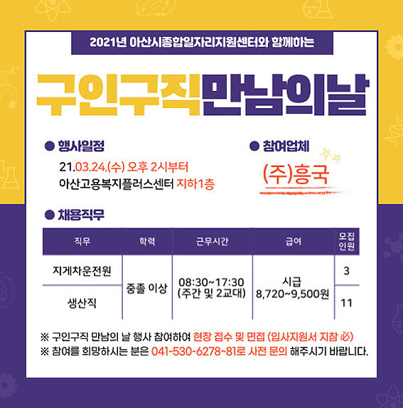 ÀÚ¼¼ÇÑ »çÇ×Àº ¾Æ»ê½ÃÁ¾ÇÕÀÏÀÚ¸®Áö¿ø¼¾ÅÍ È¨ÆäÀÌÁö(https://www.asan.go.kr/job/)¿¡¼ È®ÀÎ ÇÒ ¼ö ÀÖ´Ù.