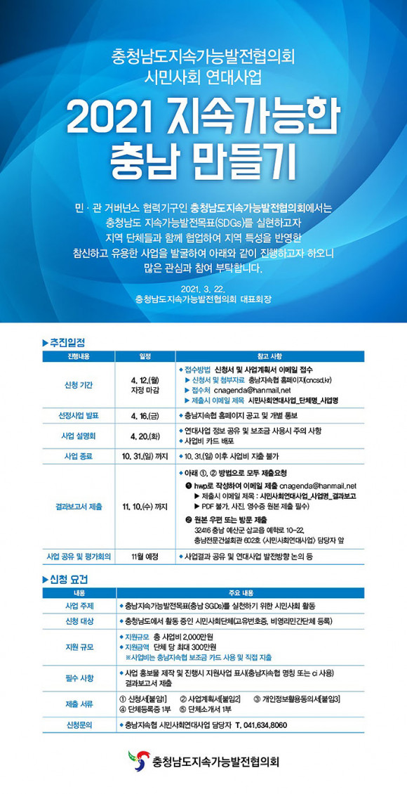 ½Åû¸¶°¨Àº 4¿ù 12ÀϱîÁöÀ̸ç Ãæ³²Áö¼ÓÇù e-mailÀ» ÅëÇØ ½Åû °¡´ÉÇϸç, ½Åû¼ ¹× Ãæ³²Áö¼Ó°¡´É¹ßÀü¸ñÇ¥(SDGs) µî °ü·Ã³»¿ëÀº Ãæ³²Áö¼ÓÇù ȨÆäÀÌÁö-°øÁö»çÇ×(www.cncsd.kr)À» Âü°íÇÏ¸é µÈ´Ù.