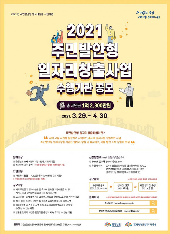 Ãæ³²µµ´Â ´ÙÀ½´Þ 30ÀϱîÁö Áö¿ª ÀÏÀÚ¸® âÃâÀ» À§ÇÑ ¡®ÁֹΠ¹ß¾ÈÇü ÀÏÀÚ¸® âÃâ »ç¾÷¡¯ ¼öÇà±â°ü °ø¸ð¸¦ ÁøÇàÇÑ´Ù°í 3¿ù 29ÀÏ ¹àÇû´Ù.