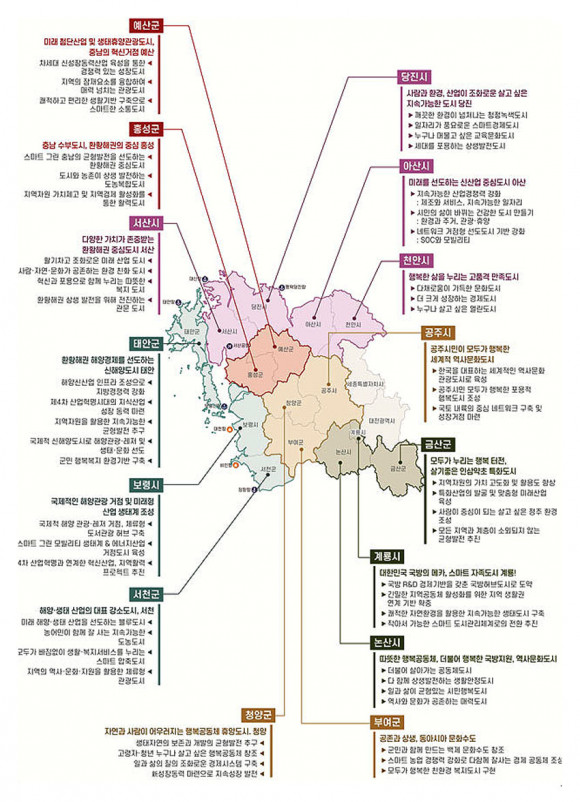 ±¸Ã¼ÀûÀ¸·Î ¡âÇູÇÑ »îÀ» ´©¸®´Â °íǰ°Ý ¸¸Á·µµ½Ã(õ¾È) ¡â½Ã¹ÎÀÌ ¸ðµÎ°¡ ÇູÇÑ ¼¼°èÀû ¿ª»ç¹®Èµµ½Ã(°øÁÖ) ¡â±¹Á¦ÀûÀÎ ÇØ¾ç°ü±¤ °ÅÁ¡ ¹× ¹Ì·¡Çü »ê¾÷»ýŰè Á¶¼º(º¸·É) ¡â¹Ì·¡¸¦ ¼±µµÇÏ´Â ½Å»ê¾÷ Á߽ɵµ½Ã(¾Æ»ê) ¡â´Ù¾çÇÑ °¡Ä¡°¡ Á¸Áß¹Þ´Â È¯È²ÇØ±Ç Á߽ɵµ½Ã(¼»ê) ¡âµû¶æÇÑ Çູ°øµ¿Ã¼, ´õºÒ¾î ÇູÇÑ ±¹¹æÁö¿ø, ¿ª»ç¹®Èµµ½Ã(³í»ê) ¡â´ëÇѹα¹ ±¹¹æÀÇ ¸ÞÄ«, ½º¸¶Æ® ÀÚÁ·µµ½Ã(°è·æ) ¡â»ç¶÷°ú ȯ°æ, »ê¾÷ÀÌ Á¶È·Î¿î »ì°í ½ÍÀº Áö¼Ó°¡´ÉÇÑ µµ½Ã(´çÁø) ¡â¸ðµÎ°¡ ´©¸®´Â ÇູÅÍÀü, »ì±â ÁÁÀº Àλï¾àÃÊ Æ¯Èµµ½Ã(±Ý»ê) ¡â°øÁ¸°ú »ó»ý, µ¿¾Æ½Ã¾Æ ¹®È¼öµµ(ºÎ¿©) ¡âÇØ¾ç»ýÅ »ê¾÷ÀÇ ´ëÇ¥ °¼Òµµ½Ã(¼Ãµ) ¡âÀÚ¿¬°ú »ç¶÷ÀÌ ¾î¿ì·¯Áö´Â Çູ°øµ¿Ã¼ È޾絵½Ã(û¾ç) ¡âÃæ³² ¼öºÎµµ½Ã, È¯È²ÇØ±ÇÀÇ Áß½É(È«¼º) ¡â¹Ì·¡ ÷´Ü»ê¾÷ ¹× »ýÅÂÈÞ¾ç°ü±¤µµ½Ã, Ãæ³²ÀÇ Çõ½Å°ÅÁ¡(¿¹»ê) ¡âÈ¯È²ÇØ±Ç ÇØ¾ç°æÁ¦¸¦ ¼±µµÇÏ´Â ½ÅÇØ¾çµµ½Ã(žÈ) µîÀÌ´Ù.