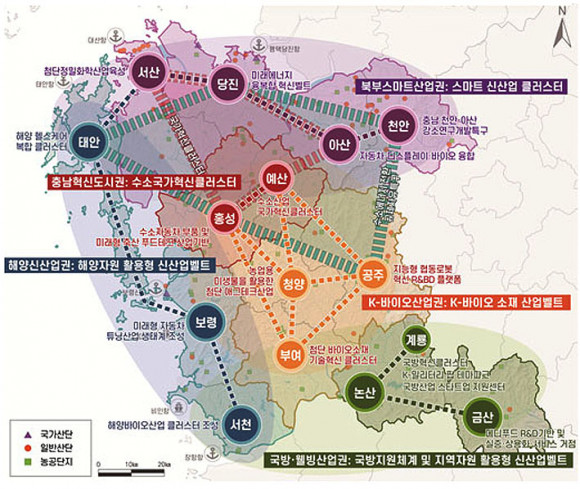 °ø°£ÀûÀ¸·Î´Â ¼ÇؾȱÇ, ºÏºÎ±Ç, ±Ý°±Ç 3´ë ±ÕÇü¹ßÀü ±Ç¿ª°ú ºÏºÎ½º¸¶Æ®»ê¾÷±Ç, Ãæ³²Çõ½Åµµ½Ã±Ç, ÇØ¾ç½Å»ê¾÷±Ç, K-¹ÙÀÌ¿À»ê¾÷±Ç, ±¹¹æ¡¤À£ºù»ê¾÷±Ç 5´ë »ê¾÷¹ßÀü ±Ç¿ª µî °èȹ±Ç¿ªÀ» À¯¿¬ÇÏ°Ô ±¸»óÇÔÀ¸·Î½á ¿¬´ë¿Í Çù·ÂÀ» ÃËÁøÇϰí, »ó»ý ¹ßÀüÀ» Ȱ¼ºÈÇÑ´Ù.