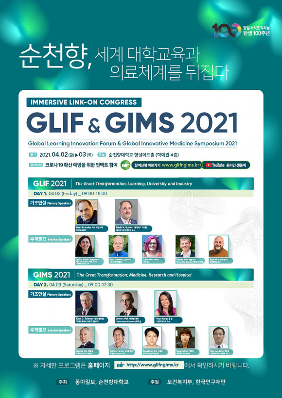 ¼øÃµÇâ´ëÇб³(ÃÑÀå ±è½Â¿ì)°¡ ¼¼°è ±³À° ¹× ÀÇ·á ¼®Çеé°ú ÇÔ²²ÇÏ´Â ±¹Á¦ ½ÉÆ÷Áö¾öÀÎ ¡®GLIF & GIMS 2021(Global Learning Innovation Forum & Global Innovative Medicine Symposium 2021)¡¯À» Çѱ¹½Ã°£À¸·Î 4¿ù 2ÀÏ 9½ÃºÎÅÍ ÀÌÆ²°£ ¼øÃµÇâ´ë Çâ¼³¾ÆÆ®È¦¿¡¼ O2O(Online to Offline) ÇÏÀ̺긮µå ¹æ½ÄÀ¸·Î °³ÃÖÇÑ´Ù.