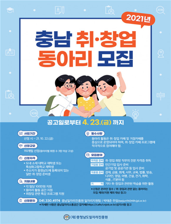 ¡°Ãæ³² Ãë¤ýâ¾÷ µ¿¾Æ¸® Áö¿ø»ç¾÷¡±¿¡´Â Ãæ³²µµ¿¡ °ÅÁÖÇϴ û³â ¶Ç´Â Áö¿ª ´ëÇÐ ¹× Ư¼ºÈ°í±³»ýÀ¸·Î ±¸¼ºµÈ µ¿¾Æ¸®(3¸í ÀÌ»óÀ¸·Î ±¸¼º)°¡ Âü¿©ÇÒ ¼ö ÀÖÀ¸¸ç, ¼±Á¤µÈ µ¿¾Æ¸®¿¡°Ô´Â Ãë¤ýâ¾÷ Áö¿ø±Ý 100¸¸ ¿ø°ú Ãë¤ýâ¾÷ Ä«Æä °ø°£À» Ȱ¿ëÇÑ È°µ¿ °ø°£, ±×¸®°í Ãë¤ýâ¾÷ Ä«Æä¿¡¼ ¿î¿µÇÏ´Â ´Ù¾çÇÑ Ãë¾÷ ÇÁ·Î±×·¥À» Áö¿øÇÑ´Ù.