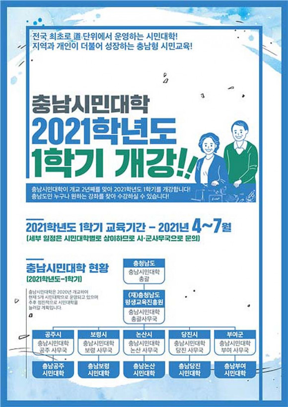 Ãæ³²½Ã¹Î´ëÇÐÀº µµ¹Î°ú Áö¿ª»çȸ°¡ ´õºÒ¾î ¼ºÀåÇÏ´Â Ãæ³²Çü ½Ã¹Î±³À°À» ¸ñÇ¥·Î Áö³ 2020³â 9¿ù¿¡ 4°³ ½Ã¹Î´ëÇÐ(°øÁÖ, ³í»ê, ´çÁø, ºÎ¿©)À¸·Î °³±³ÇßÀ¸¸ç, ¿ÃÇØºÎÅÍ´Â Ãæ³²º¸·É½Ã¹Î´ëÇÐÀÌ Ãß°¡·Î °³±³ÇÏ¿© 5°³ ½Ã¹Î´ëÇÐÀÌ ¿î¿µµÈ´Ù.