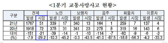 ƯÈ÷, À½ÁÖ¿îÀü »ç¸Á»ç°í´Â ÀÛ³â 8¸í¿¡¼ ¿ÃÇØ 1¸íÀ¸·Î 87.5%(-7¸í) °¡Àå Å©°Ô °¨¼ÒÇß°í, ÀÌ¾î¼ È¹°Â÷ 56.3%(-9¸í), °í·ÉÀÚ 45.2%(-14¸í), º¸ÇàÀÚ 43.5%(-10¸í), ÀÌ·ûÂ÷ 33.3%(-2¸í) °¨¼ÒÇß´Ù.