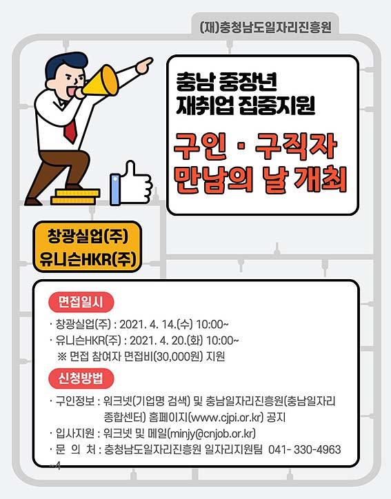 ÃæÃ»³²µµ¿Í (Àç)ÃæÃ»³²µµÀÏÀÚ¸®ÁøÈï¿ø(¿øÀå À̽ÿì)¿¡¼´Â Äڷγª19·Î Ãë¾÷³À» °Þ°í ÀÖ´Â ±¸Á÷ÀÚ¿¡°Ô Ãë¾÷±âȸ¸¦ Á¦°øÇϰíÀÚ ¿À´Â 4¿ù 14Àϰú 20ÀÏ Ã¢±¤½Ç¾÷(ÁÖ)°ú À¯´Ï½¼HKR(ÁÖ) ¿¡¼ ¼Ò±Ô¸ð ä¿ëÇà»çÀÎ ¡®±¸ÀΡ¤±¸Á÷ ¸¸³²ÀÇ ³¯¡¯À» °³ÃÖÇß´Ù°í ¹àÇû´Ù.