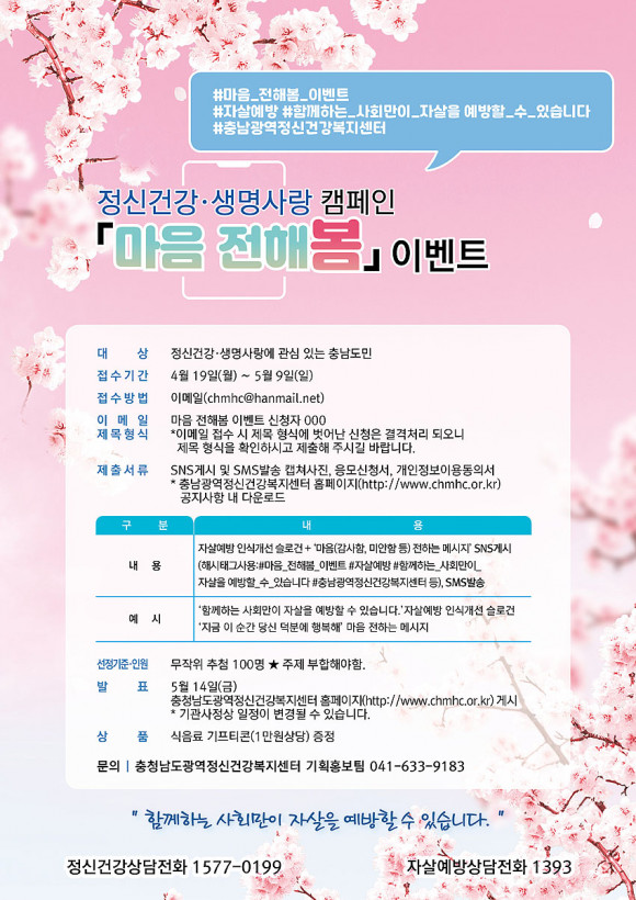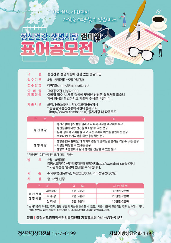 °ø¸ðÀü ¹× À̺¥Æ®´Â »ý¸í»ç¶ûÁÖ°£(4.19¡5.9)µ¿¾È Ãæ³²±¤¿ªÁ¤½Å°Ç°º¹Áö¼¾ÅÍ À̸ÞÀÏ(chmhc@hanmail.net)·Î Âü¿©ÇÒ ¼ö ÀÖ´Ù.
