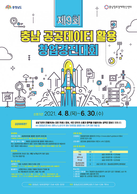 ÃæÃ»³²µµ°¡ ÁÖÃÖÇϰí Ãæ³²Ã¢Á¶°æÁ¦Çõ½Å¼¾ÅÍ(¼¾ÅÍÀå °ÈñÁØ)°¡ ÁÖ°üÇÏ´Â ¡®Á¦9ȸ Ãæ³² °ø°øµ¥ÀÌÅÍ È°¿ë â¾÷°æÁø´ëȸ¡¯°¡ Áö³ 4¿ù 8ÀϺÎÅÍ Âü°¡½Åû Á¢¼ö¸¦ ½ÃÀÛÇß´Ù.