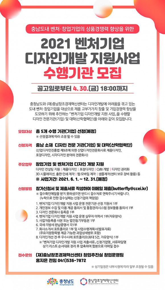 Ãæ³²Çõ½Å¼¾ÅÍ´Â ÃæÃ»³²µµ¿Í ÇÔ²² ÃßÁøÇÏ´Â ¡®2021 º¥Ã³±â¾÷ µðÀÚÀÎ °³¹ß Áö¿ø »ç¾÷¡¯À» ¼öÇàÇÒ µµ³» Àü¹® µðÀÚÀαâ¾÷(±â°ü)À» ¿À´Â 4¿ù 30ÀϱîÁö ¸ðÁýÇÑ´Ù°í ¹àÇû´Ù.
