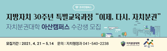 2021³â ÀÚÄ¡ºÐ±Ç´ëÇÐ ¾Æ»êÄ·ÆÛ½º´Â Áö¹æÀÚÄ¡ 30ÁÖ³âÀ» ¸Â¾Æ Çѱ¹ Áö¹æÀÚÄ¡ÀÇ ¿ª»ç¸¦ µ¹¾Æº¸°í ¹Ì·¡ÀÇ °úÁ¦¸¦ »ìÆìº¸´Â ±³À°°úÁ¤À¸·Î 1°´ç 20ºÐ ³»¿Ü ÃÑ 18°À¸·Î ±¸¼ºµÆ´Ù.