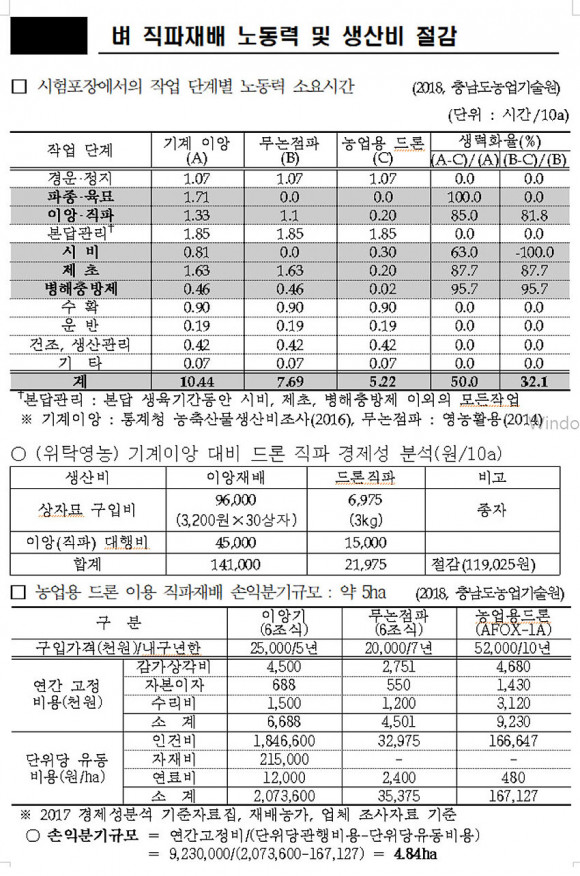 °æ¿îºÎÅÍ ¼öÈ®¡¤°ü¸®±îÁö ³í 10a ´ç ³óÀÛ¾÷ ½Ã°£ÀÌ ±â°è À̾ÓÀÇ °æ¿ì 10.44½Ã°£ÀÌ µå´Â ¹Ý¸é, µå·Ð Á÷ÆÄ´Â 5.22½Ã°£À¸·Î Àý¹Ý¿¡ ºÒ°úÇÏ´Ù.