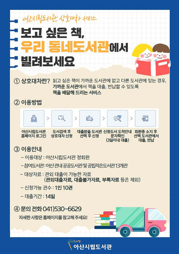 »óÈ£´ëÂ÷ ¼ºñ½º´Â ¾Æ»ê½Ã¸³µµ¼°ü Á¤È¸¿øÀÌ¸é ´©±¸³ª ÀÌ¿ëÇÒ ¼ö ÀÖÀ¸¸ç 1Àδç 10±Ç±îÁö °¡´ÉÇÏ°í ´ëÃâ±â°£Àº 14ÀÏÀÌ´Ù. µµ¼°ü ȨÆäÀÌÁö¿¡¼ ½Åû ÈÄ µµ¼°¡ ¼ö·ÉÇϰíÀÚ ÇÏ´Â µµ¼°ü¿¡ µµÂøÇß´Ù´Â ¹®ÀÚ¸¦ ¹ÞÀ¸¸é 3ÀÏ À̳»¿¡ ¿äûÇÑ µµ¼¸¦ ´ëÃâ ¹ÞÀ» ¼ö ÀÖ´Ù.