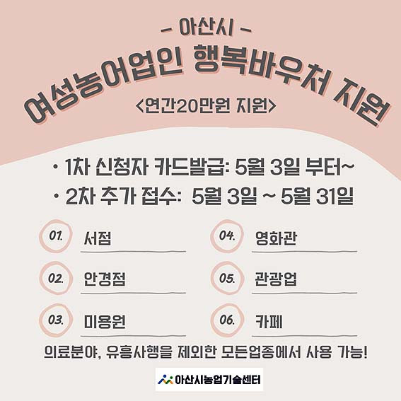 ¾Æ»ê½Ã(½ÃÀå, ¿À¼¼Çö)°¡ ¿¬°£ 20¸¸ ¿øÀ» Áö¿øÇÏ´Â ¡®¿©¼º³ó¾î¾÷ÀÎ Çູ¹Ù¿ìó Áö¿ø»ç¾÷¡¯ Ä«µå ¹ß±ÞÀ» 5¿ù 3ÀϺÎÅÍ ½ÃÀÛÇÑ´Ù.