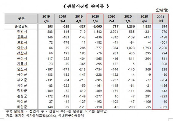¡ãÀα¸À̵¿Àº ¼¼Á¾(4õ306¸í), Ãæ³²(314¸í)ÀÌ ¼øÀ¯ÀÔÀ» º¸¿© ÃæÃ»±Ç Àüü ÀüÀÔÀα¸°¡ ÀüÃâÀα¸º¸´Ù ¸¹¾Æ 198¸í ¼øÀ¯ÀÔÀ¸·Î ³ªÅ¸³µÀ¸³ª, ´ëÀü(-3,045¸í), ÃæºÏ(-1,377¸í)Àº ¼øÀ¯ÃâÀÌ ´õ ¸¹¾Ò´Ù.