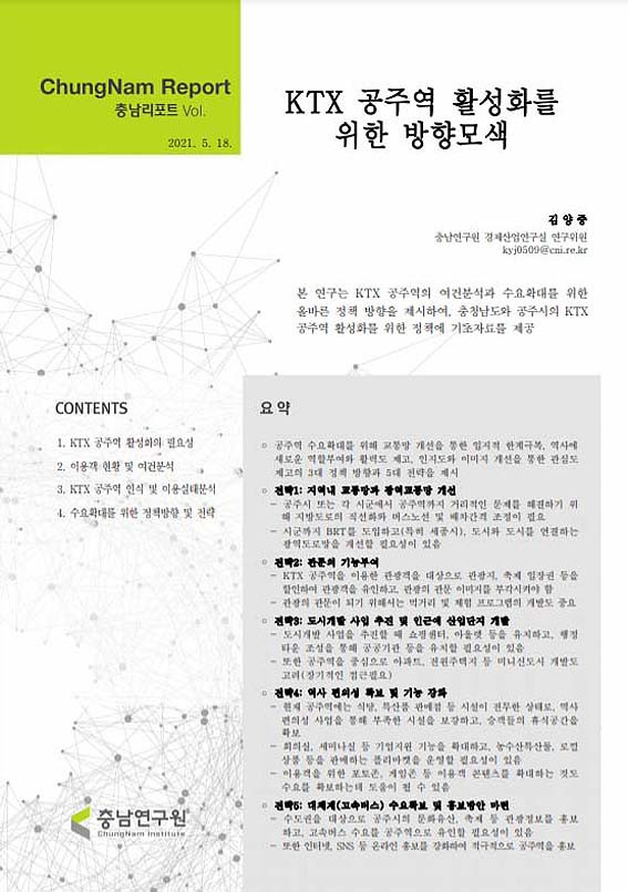 5¿ù 20ÀÏ Ãæ³²¿¬±¸¿ø(¿øÀå À±È²) ±è¾çÁß ¿¬±¸À§¿øÀº ¡®KTX °øÁÖ¿ª Ȱ¼ºÈ¸¦ À§ÇÑ ¹æÇâ ¸ð»ö¡¯ ¿¬±¸º¸°í¼¿¡¼ ¡°°øÁֽà ¶Ç´Â ÁÖº¯ ½Ã±º¿¡¼ KTX °øÁÖ¿ª±îÁö À̵¿ÇÏ´Â °Å¸®¿Í ½Ã°£ÀûÀÎ ¹®Á¦¸¦ ÇØ°áÇϱâ À§ÇØ Áö¹æµµ·ÎÀÇ Á÷¼±È¿Í ¹ö½º³ë¼± ¹× ¹èÂ÷°£°Ý Á¶Á¤ÀÌ ÇÊ¿äÇÏ´Ù¡±¸ç ¡°Æ¯È÷ ¼¼Á¾½Ã¸¦ Áß½ÉÀ¸·Î ÇÑ ÁÖº¯ ½Ã±º±îÁö BRT¸¦ µµÀÔÇÏ´Â µî ±¤¿ªµµ·Î¸ÁÀ» °³¼±ÇØ¾ß ÇÑ´Ù¡±°í ÁÖÀåÇß´Ù.