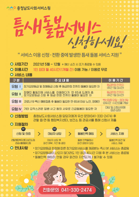 ½Åû¹æ¹ýÀº »çȸ¼ºñ½º¿ø ´ã´çÀÚ¿Í À¯¼±(041-330-2474) ³íÀÇ ÈÄ °ÅÁÖÁö °üÇÒ À¾¡¤¸é¡¤µ¿ ÇàÁ¤º¹Áö¼¾ÅÍ, º¸°Ç¼Ò µî °ü°ø¼¸¦ ÅëÇØ ½Åû Á¢¼öÇÏ¸é µÈ´Ù. ¼ºñ½º ÀÌ¿ë½Ã°£Àº 1ÀÎ ÃÖ´ë ¿ù 40½Ã°£(1°³¿ù °£) ÀÌ¿ë °¡´ÉÇϸç ÀÌ¿ë·á´Â ¹«·áÀÌ´Ù.