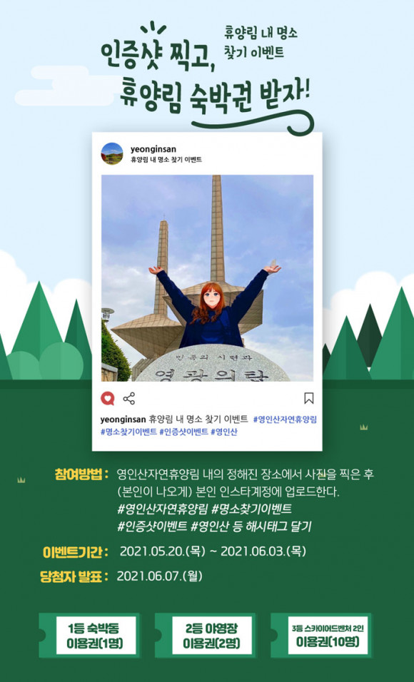 ³»´Þ 3ÀϱîÁö ÁøÇàµÇ´Â À̹ø À̺¥Æ®´Â È޾縲 ³»ÀÇ Á¤ÇØÁø Àå¼Ò(±ê´ëºÀ, »óÅõºÀ, ¿µÀλêÁ¤»ó, °ÅºÏÀÌ À½¼ö´ë, ¿µ±¤ÀÇž)¿¡¼ »çÁøÀ» Âï°í º»ÀÎÀÇ SNS °èÁ¤¿¡ ¿µÀλêÀÚ¿¬È޾縲 ÀνºÅ¸±×·¥(@yeonginsan) ÅÂ±×¿Í ÇÔ²² »çÁøÀ» °Ô½ÃÇØ Âü¿©ÇÒ ¼ö ÀÖ´Ù.