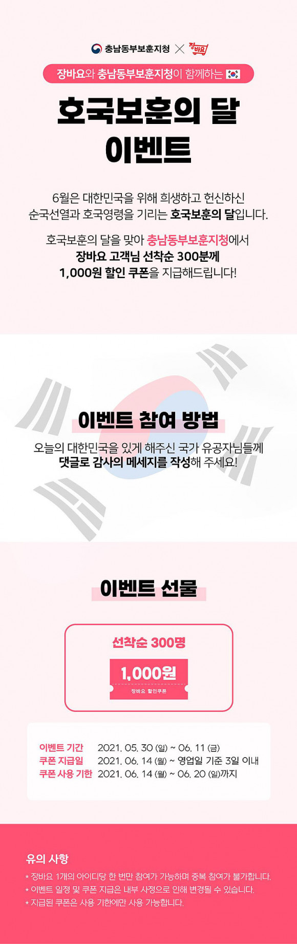 À̹ø À̺¥Æ®´Â È£±¹º¸ÈÆÀÇ ´ÞÀ» ¾Ë¸®°í ±¹°¡À¯°øÀÚÀÇ Èñ»ý°ú Çå½Å¿¡ ´ëÇÑ Áö¿ª»çȸÀÇ ¿¹¿ì ºÐÀ§±â È®»êÀ» À§ÇØ Ãæ³²µ¿ºÎº¸ÈÆÁöû°ú Àå¹Ù¿ä°¡ Çù¾÷ÇØ ÃßÁøÇßÀ¸¸ç, ¡®Àå¹Ù¿ä¡¯ ¾Û¿¡¼ È£±¹º¸ÈÆÀÇ ´Þ °ü·Ã ¹®Á¦¸¦ ¸ÂÈ÷¸é ¼±Âø¼ø 300¸í¿¡°Ô ÇÒÀÎÄíÆùÀ» Áö±ÞÇÑ´Ù.