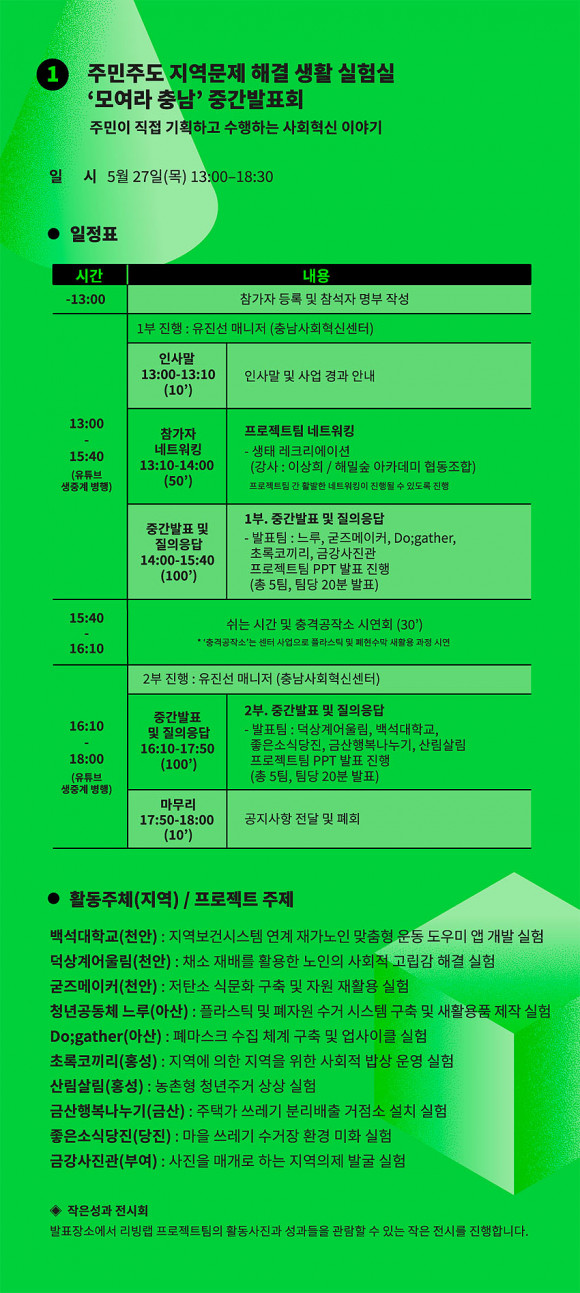 ¡®¸ð¿©¶óÃæ³²¡¯¿¡ Âü¿©Çϰí ÀÖ´Â ÆÀµéÀº ¡®Ã¤¼Ò Àç¹è¸¦ Ȱ¿ëÇÑ ³ëÀÎÀÇ »çȸÀû °í¸³°¨ ÇØ°á ½ÇÇ衯(´ö»ó°è¾î¿ï¸²), ¡®Æó¸¶½ºÅ© ¼öÁý ¹× ¾÷»çÀÌŬ ½ÇÇ衯(Do;gather), ¡®³óÃÌÇü û³âÁÖ°Å »ó»ó ½ÇÇ衯(»ê¸²»ì¸²) µîÀ» Çϰí ÀÖ´Ù.