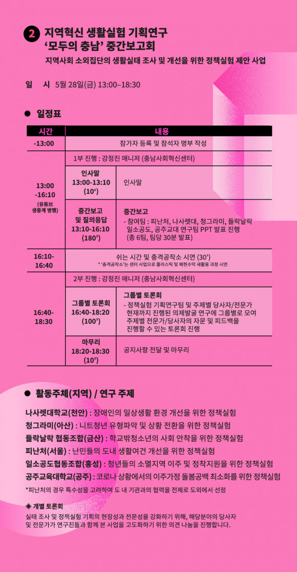 27ÀÏ¿¡´Â ÁÖ¹ÎÁÖµµ Áö¿ª¹®Á¦ ÇØ°á »ýȰ½ÇÇè ¡®¸ð¿©¶óÃæ³²¡¯ÀÇ Áß°£¹ßǥȸ ¹× ÇÁ·ÎÁ§Æ®ÆÀ°úÀÇ ³×Æ®¿öÅ·ÀÌ ÁøÇàµÆ°í, 28ÀÏ¿¡´Â Áö¿ªÇõ½Å »ýȰ½ÇÇè ±âȹ¿¬±¸ÀÎ ¡®¸ðµÎÀÇÃæ³²¡¯ÀÇ Áß°£º¸°íȸ¿Í ±×·ìº° Åä·Ðȸ°¡ ½Ç½ÃµÆ´Ù.