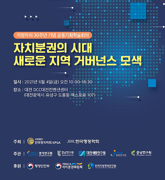 Ãæ³²¿¬±¸¿øÀº ¿À´Â 6¿ù 4ÀÏ ¿ÀÀü 10½Ã DCC´ëÀüÄÁº¥¼Ç¼¾ÅÍ¿¡¼ ¡®ÀÚÄ¡ºÐ±ÇÀÇ ½Ã´ë, »õ·Î¿î Áö¿ª °Å¹ö³Í½º ¸ð»ö¡¯À» ÁÖÁ¦·Î Áö¹æÀÚÄ¡ 30ÁÖ³âÀ» ±â³äÇÏ´Â °øµ¿ÇмúȸÀÇ(ÀÌÇÏ ÇмúȸÀÇ)¸¦ °³ÃÖÇÑ´Ù°í 6¿ù 2ÀÏ ¹àÇû´Ù.