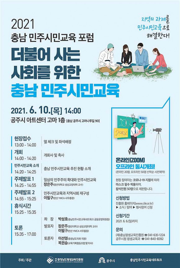 (Àç)ÃæÃ»³²µµÆò»ý±³À°ÁøÈï¿ø(¿øÀå Á¶ÀÌÇö)Àº ¡®´õºÒ¾î »ì¾Æ°¡´Â »çȸ¸¦ À§ÇÑ Ãæ³² ¹ÎÁֽùα³À°¡¯À̶ó´Â ÁÖÁ¦·Î 6¿ù 10ÀÏ ¿ÀÈÄ 2½Ã, ¡®°øÁÖ ¾ÆÆ®¼¾ÅÍ °í¸¶¡¯¿Í¡®¿Â¶óÀÎ(ZOOM)¡¯À¸·Î µ¿½Ã¿¡ Á¤ºÎÀÇ ¹æ¿ª¼öÄ¢ Áؼö¸¦ öÀúÈ÷ ÁöŰ¸é¼ Ãæ³² ¹ÎÁֽùα³À° Æ÷·³À» °³ÃÖÇÑ´Ù.