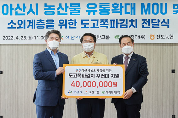 | | ¡è¡è ¡ã¼Ò¿Ü°èÃþÀ» À§ÇÑ µµ°íÂÊÆÄ±èÄ¡ Àü´Þ½Ä ±â³ä»çÁø. (¿ÞÂʺÎÅÍ) ±è¼¼ÁØ È£¹Ý±×·ì Àü¹«, ¿À¼¼Çö ½ÃÀå, ¹ÚÀç¿í ´ë¾ÆÃ»°ú ´ëÇ¥ <»çÁøÁ¦°ø=¾Æ»ê½Ã> | ¨Ï ¿Â¾ç½Å¹® | | ÇÑÆí, À̳¯ ´ë¾ÆÃ»°ú¿Í ¸ð ±â¾÷ÀΠȣ¹Ý±×·ìÀº ¾Æ»ê½Ã µ¶°Å³ëÀÎ µî ¼Ò¿Ü°èÃþ¿¡ Àü´ÞÇØ´Þ¶ó¸ç 4õ¸¸ ¿ø »ó´çÀÇ 3kg µµ°íÂÊÆÄ±èÄ¡ 1285¼¼Æ®¸¦ ±âºÎÇß´Ù. ´ë¾ÆÃ»°ú´Â µµ°íÂÊÆÄ¸¦ ¸Å³â 40¾ï ¿ø ÀÌ»ó Ãë±ÞÇÏ´Â ÃÖ´ë ÃâÇÏó´Ù.