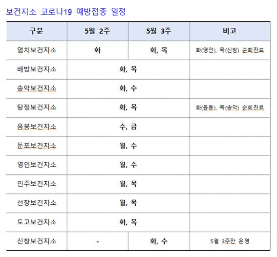 ¾Æ»ê½Ã°¡ Äڷγª19 Á¢Á¾ ±â°üÀÌ ¾ø´Â Áö¿ª ¾î¸£½ÅµéÀÇ ¿øÈ°ÇÑ Äڷγª19 4Â÷ Á¢Á¾À» À§ÇØ 11°³ º¸°ÇÁö¼Ò¿¡¼ 5¿ù µÑ° ÁÖ, ¼Â° ÁÖ 2ÁÖ°£ Äڷγª19 Á¢Á¾À» ½ÃÇàÇÑ´Ù.