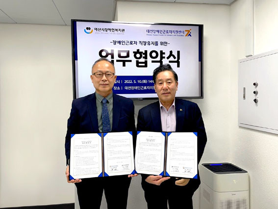 | | ¡è¡è <»çÁøÁ¦°ø=¾Æ»ê½ÃÀå¾ÖÀκ¹Áö°ü> | ¨Ï ¿Â¾ç½Å¹® | | ¾Æ»ê½ÃÀå¾ÖÀκ¹Áö°ü(°üÀå ÀÌâȣ)Àº 5¿ù 10ÀÏ ¿ÀÈÄ 2½Ã, ´ëÀüÀå¾ÖÀαٷÎÀÚÁö¿ø¼¾ÅÍ(¼¾ÅÍÀå ÃÖ¿ÀÀ±)¿Í Àå¾ÖÀÎ ±Ù·ÎÀÚ Á÷ÀåÀ¯Áö¸¦ À§ÇÑ ¾÷¹«Çù¾àÀ» ü°áÇß´Ù.