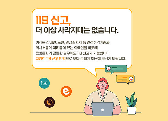 119´Ù¸Åü ½Å°í¼ºñ½º´Â ¹®ÀÚ, ¿µ»óÅëÈ, ½º¸¶Æ®Æù ¾Û µîÀ» ÅëÇØ¼ ½Å°í°¡ °¡´ÉÇØ ¿Ü±¹ÀÎÀ̳ª û°¢Àå¾ÖÀÎ µî ÀÇ»ç¼ÒÅëÀÌ ¾î·Æ°Å³ª À½¼ºÅëȰ¡ °ï¶õÇÑ °æ¿ì¿¡µµ ±ä±Þ »óȲÀ» ¾Ë¸± ¼ö ÀÖ°Ô ÇØÁØ´Ù.