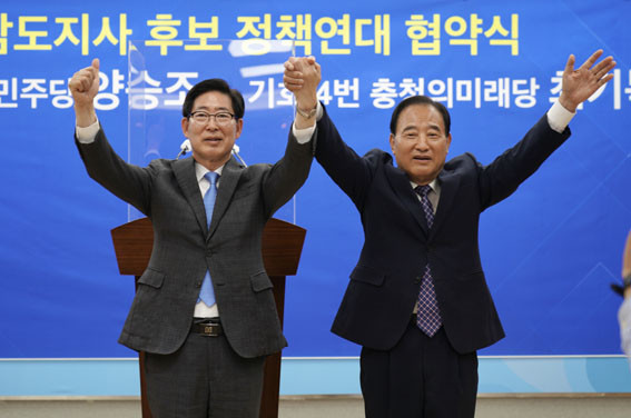 Ãֱ⺹ È帴 ¡®ÃæÃ»³²µµ µµÁö»ç Èĺ¸ Á¤Ã¥ ¿¬´ë ÇÕÀǹ®¡¯¿¡¼ ¡°¾ç Èĺ¸¿Í Á¤Ã¥°ø¾à ¿¬´ë¸¦ ÅëÇØ Ãæ³²µµ¹Î°ú ¾à¼ÓÇÑ ²ÞÀ» ½ÇÇöÇϰíÀÚ Èĺ¸Á÷À» »çÅðÇÏ°í ¾ç½ÂÁ¶ Èĺ¸ ÁöÁö¸¦ ¼±¾ðÇÑ´Ù¡±°í ¹àÇû´Ù.