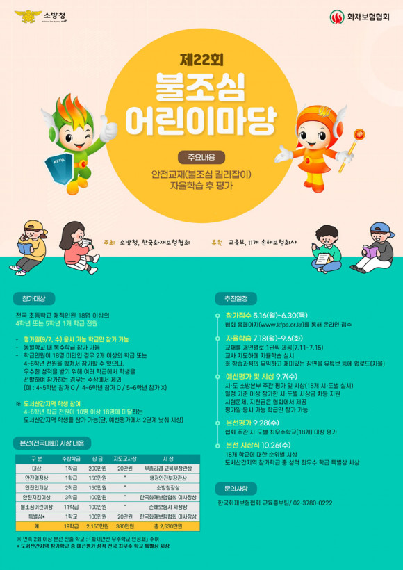 ¼Ò¹æÃ»°ú Çѱ¹ÈÀ纸ÇèÇùȸ°¡ °øµ¿ ÁÖÃÖÇÏ´Â ¡®ºÒÁ¶½É ¾î¸°À̸¶´ç¡¯Àº ¾î¸°À̵éÀÌ ÈÀç, ÀÚ¿¬Àç³ ¹× »ýȰ¾ÈÀü¿¡ ´ëÇÑ ±âÃÊÁö½ÄÀ» ÇнÀ°ú Æò°¡¸¦ ÅëÇØ ÀÍÈûÀ¸·Î½á Á¶±â ¾ÈÀü¹®È È®»êÀ» À§ÇØ ÃßÁøµÈ´Ù.