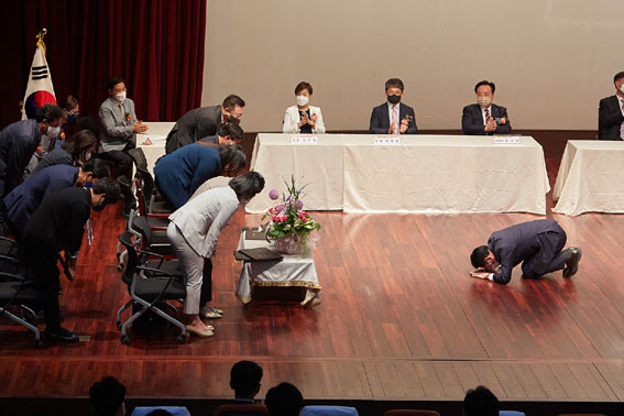 ÇÑÆí À̳¯ ´ç¼±Áõ ±³ºÎ½Ä¿¡´Â °Ç°»óÀÇ ÀÌÀ¯·Î ºÒÂüÇÑ ±¹¹ÎÀÇÈû ±èÀº¾Æ ¾Æ»ê½ÃÀÇ¿ø ¸¶¼±°Å±¸ ´ç¼±ÀÎÀ» Á¦¿ÜÇÑ ¾Æ»ê½ÃÀå°ú Ãæ³²µµÀÇ¿ø ¹× ¾Æ»ê½ÃÀÇ¿ø ´ç¼±ÀÎ ¸ðµÎ°¡ Âü¼®ÇØ ´ç¼±ÁõÀ» ±³ºÎ¹Þ°í ÇâÈÄ ÀÇÁ¤È°µ¿¿¡ ´ëÇÑ °¢¿À¸¦ ´ÙÁ³´Ù.