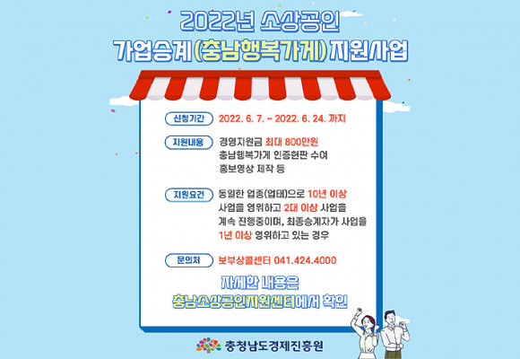 | | ¨Ï ¿Â¾ç½Å¹® | | ÃæÃ»³²µµ¿Í Ãæ³²°æÁ¦ÁøÈï¿ø(¿øÀå ¿À±¤¿Á)¿¡¼´Â °¡¾÷À» ½Â°èÇÏ¿© »ç¾÷ÀåÀ» ¿î¿µ ÁßÀÎ ¼Ò»ó°øÀÎÀ» ¹ß±¼ÇÏ¿© Ãæ³²Çü Àå¼ö±â¾÷ À°¼ºÀ» Áö¿øÇÏ´Â ¼Ò»ó°øÀÎ °¡¾÷½Â°è(Ãæ³²Çູ°¡°Ô) Âü¿©¾÷ü¸¦ ¸ðÁýÇÑ´Ù°í ¹àÇû´Ù.