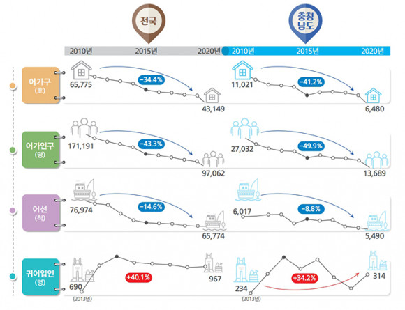 2020³â ±âÁØ Ãæ³²µµ ¾î°¡ °í·Éºñ´Â Æò±Õ 45.2%·Î, ÀÌ´Â Àü±¹ ¾î°¡ °í·Éºñ Æò±Õ(36.0%)º¸´Ù 9.2% ³ô´Ù. Áï µµ³» ¾î¾÷ÀÎ 100¸í Áß 45¸íÀÌ 65¼¼ ÀÌ»óÀ̶ó´Â Àǹ̴Ù.