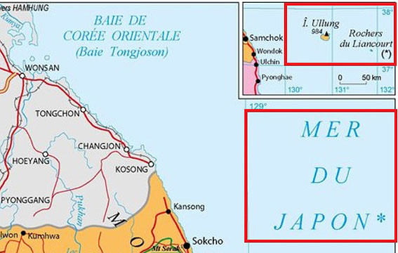 ÁÖÇÑ ¹Ì±¹´ë»ç°ü Áöµµ¿¡´Â µ¿ÇØ¿Í µ¶µµ Ç¥±â°¡ ¾Æ¿¹ ¾ø°í, ÁÖÇÑ ÇÁ¶û½º´ë»ç°ü Áöµµ¿¡´Â µ¿Çذ¡ ¾Æ´Ñ ¡®ÀϺ»ÇØ¡¯·Î, µ¶µµ°¡ ¾Æ´Ñ ¡®¸®¾ÓÄí¸£ ·Ï½º¡¯·Î Ç¥±â°¡ µÅ ÀÖ´Ù.