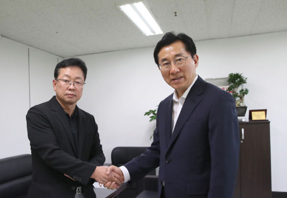 | | ¡è¡è ¡ã¹Ú°æ±Í ´ç¼±ÀÎ(¿À¸¥ÂÊ)°ú À̱â¼ö °øÀåÀåÀÌ ¸¸³ª ¾Ç¼ö¸¦ Çϰí ÀÖ´Ù. <»çÁøÁ¦°ø=»õ·Î¿î ¾Æ»ê½Ã´ë ÁغñÀ§> | ¨Ï ¿Â¾ç½Å¹® | | ¹Ú°æ±Í ¾Æ»ê½ÃÀå ´ç¼±ÀÎÀÌ Áö³ 6¿ù 14ÀÏ ÀμöÀ§¸¦ ¹æ¹®ÇÑ À̱â¼ö Çö´ëÂ÷ ¾Æ»ê°øÀåÀå(Àü¹«)À» ¸¸³ª, û³â ÀÏÀÚ¸® âÃ⠵ ¾ÕÀå¼´Þ¶ó°í ´çºÎÇß´Ù.