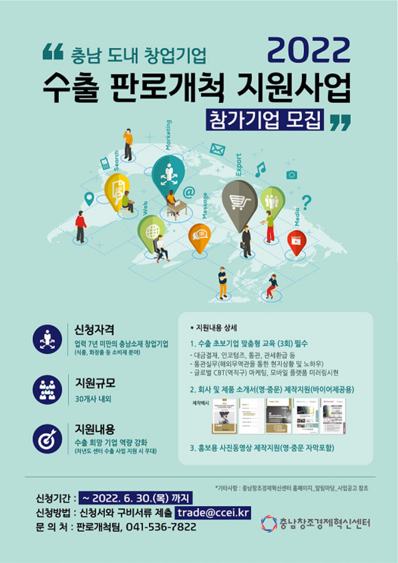 À̹ø Áö¿ø»ç¾÷¿¡ Âü°¡¸¦ Èñ¸ÁÇÏ´Â ±â¾÷Àº ÀÌ´Þ 30ÀÏ(¸ñ)±îÁö ½Åû¼¿Í ±¸ºñ¼·ù¸¦ ÷ºÎÇÏ¿© À̸ÞÀÏ(trade@ccei.kr)·Î ½ÅûÇÏ¸é µÈ´Ù.(¼±Âø¼ø 30°³»ç ¸ðÁý) ¾Æ¿ï·¯ ÀÚ¼¼ÇÑ ³»¿ëÀº Ãæ³²Ã¢Á¶°æÁ¦Çõ½Å¼¾ÅÍ È¨ÆäÀÌÁö ¡®¾Ë¸²¸¶´ç_»ç¾÷°ø°í¡¯¿¡¼ È®ÀÎÇÏ¸é µÈ´Ù.