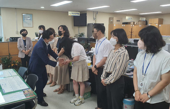 À̳¯ º»Ã» º»°ü 5ÃþºÎÅÍ ºÎ¼ ¹æ¹®À» ½ÃÀÛÇÑ ¹Ú°æ±Í ½ÃÀåÀº Á÷¿ø ÇѸí ÇѸí°ú Àλ縦 ³ª´©¸ç ¹Î¼± 8±â Áغñ¸¦ À§ÇÑ ±×µ¿¾ÈÀÇ ³ë°í¸¦ °Ý·ÁÇÏ°í ½ÃÁ¤ ºñÀüÀ» Àü´ÞÇÏ´Â ½Ã°£À» °¡Á³´Ù.