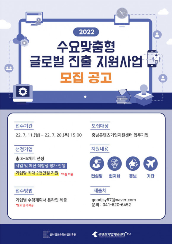 Ãæ³²Á¤º¸¹®È»ê¾÷ÁøÈï¿ø(¿øÀå ±èâ¼ö, ÀÌÇÏ ÁøÈï¿ø)ÀÌ ¿î¿µÇÏ´Â Ãæ³²ÄÜÅÙÃ÷±â¾÷Áö¿ø¼¾ÅÍ(ÀÌÇÏ Áö¿ø¼¾ÅÍ)¿¡¼ ÀÔÁÖ±â¾÷À» ´ë»óÀ¸·Î ¼ö¿ä¸ÂÃãÇü ±Û·Î¹ú ÁøÃâ Áö¿ø»ç¾÷À» ÃßÁøÇÑ´Ù.