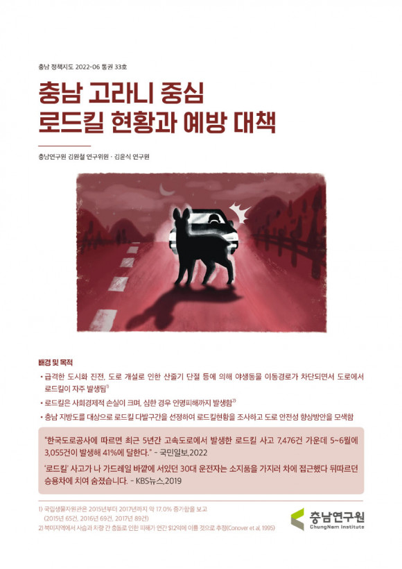 Ãæ³²¿¬±¸¿ø ±è¿øÃ¶ ¿¬±¸À§¿ø µî ¿¬±¸ÁøÀº ÃÖ±Ù ¡®Ãæ³² °í¶ó´Ï Á᫐ ·Îµåų ÇöȲ°ú ¿¹¹æ ´ëÃ¥¡¯À» ÁÖÁ¦·Î ¹ßÇ¥ÇÑ Á¤Ã¥Áöµµ¿¡¼ ¡°Ãæ³² Áö¹æµµ¸¦ ´ë»óÀ¸·Î ·Îµåų ´Ù¹ß±¸°£À» ¼±Á¤ÇØ ·Îµåų ÇöȲÀ» Á¶»çÇÏ°í µµ·Î ¾ÈÀü¼º Çâ»ó ¹æ¾ÈÀ» ¿¬±¸ÇÑ ¹Ù ÀÖ´Ù¡±¸ç ¡°·Îµåų ÇÇÇØµ¿¹°¡¤¹ß»ýÁöÁ¡ÀÇ ´Ù¾ç¼ºÀ» °í·ÁÇØ Â÷·® ¼Óµµ °¨¼Ó, µ¿¹° ÃâÇö °æ°í ¹× Â÷´Ü µîÀÇ ±³Åë¾ÈÀü´ëÃ¥À» ¼ö¸³ÇØ¾ß ÇÑ´Ù¡±°í ¸»Çß´Ù.