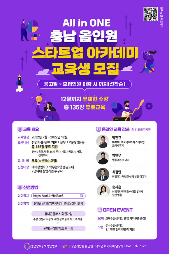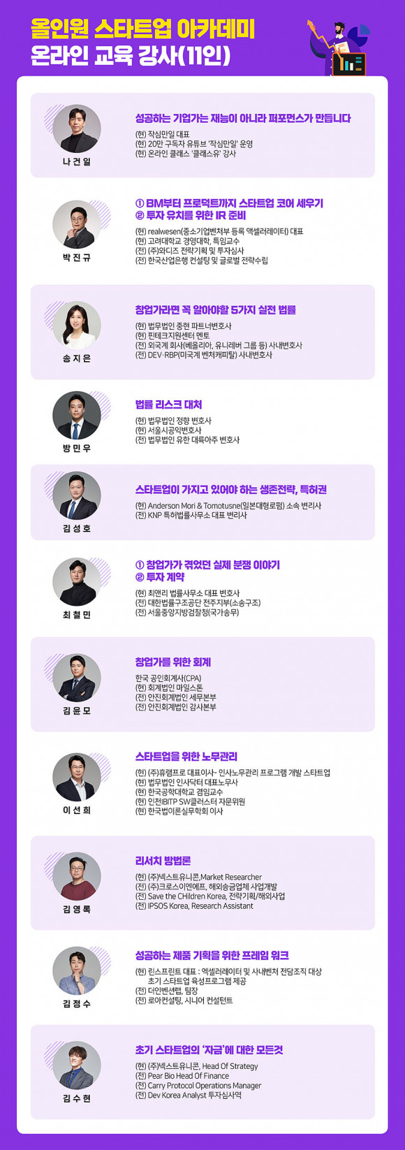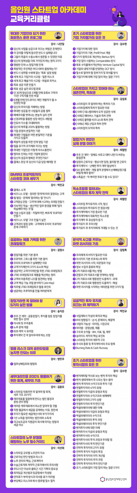 ¡®Ãæ³² ¿ÃÀοø ½ºÅ¸Æ®¾÷ ¾ÆÄ«µ¥¹Ì¡¯´Â ½ºÅ¸Æ®¾÷ ¹× ¿¹ºñâ¾÷ÀÚÀÇ ¾ÈÁ¤ÀûÀÎ ¼ºÀåÀ» À§ÇÑ Ã¢¾÷±âº»¡¤¿ª·®°È¡¤½ÉÈ ±³À°À» ¿Â¶óÀÎÀ¸·Î Á¦°øÇÒ ¿¹Á¤À¸·Î ¡ãºñÁî´Ï½º¸ðµ¨ ¡ã¸¶ÄÉÆÃ ¡ã¹ý·ü ¡ãƯÇã ¡ãȸ°è ¡ã³ë¹« ¡ãÁ¦Ç°°³¹ß ¡ãÅõÀÚ ¡ãIR ¡ã±â¾÷°¡Ä¡Æò°¡ ¡ãÀÚ±Ý µîÀÇ ´Ù¾çÇÑ ºÐ¾ßÀÇ Ã¢¾÷°ÀÇ(ÃÑ 135°)°¡ ¸¶·ÃµÅ ÀÖÀ¸¸ç ±³À°ºñ´Â Àü¾× ¹«·á·Î Áö¿øÇÑ´Ù.