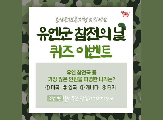 À̹ø À̺¥Æ®´Â 6?25ÀüÀï ´ç½Ã ´ëÇѹα¹À» À§ÇØ ¸ñ¼û ¹ÙÃÄ ½Î¿ö ÁØ À¯¿£±º ÂüÀü¿ë»çÀÇ Èñ»ý°ú °øÇåÀ» ³Î¸® ¾Ë¸®±â À§ÇØ Ãæ³²µ¿ºÎº¸ÈÆÁöû°ú Àå¹Ù¿ä°¡ Çù¾÷ÇØ ÃßÁøÇÏ¿´À¸¸ç, ¡®Àå¹Ù¿ä¡¯ ¾Û¿¡¼ ÄûÁ ¸ÂÃ߸é Ãß÷À» ÅëÇØ 100¸í¿¡°Ô 3õ ¿ø ÇÒÀÎÄíÆùÀ» Áö±ÞÇÑ´Ù.